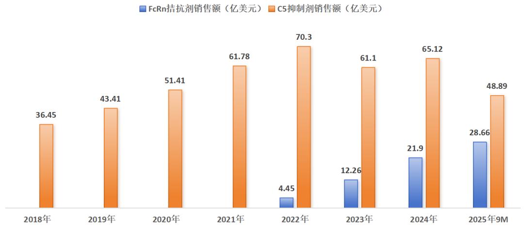 这一格局从当前市场表现中可清晰窥见:在C5抑制剂整体销售额持续上扬、稳固占据成熟市场份额的同时,FcRn拮抗剂也凭借精准的作用机制和优异的临床疗效,呈现出高速增长的态势,两者并非零和博弈,而是共同挖掘MG蓝海市场的潜力。