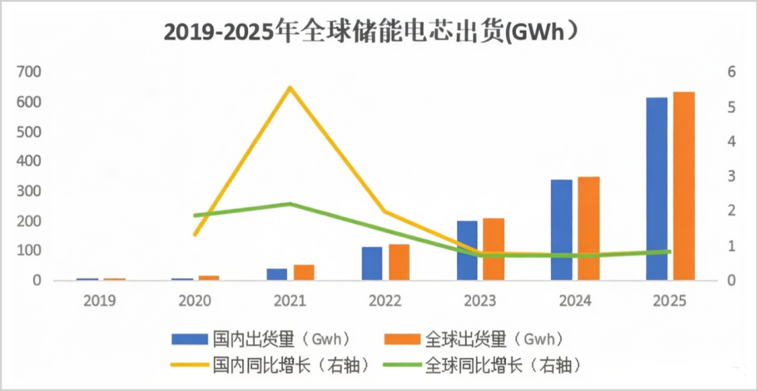 据ICC鑫椤统计,2025年全球储能电池出货640GWh,同比增长82.9%。其中国内电池厂家出货621.5GWh,同比增长82.8%。海外电池厂家出货18.5GWh,同比增长85%。