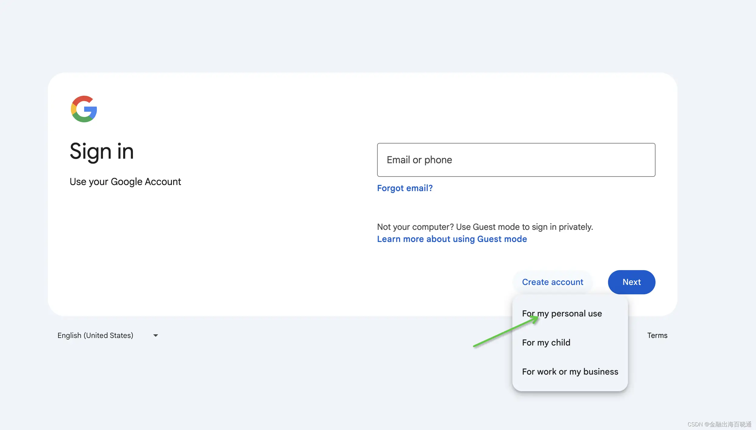 1.我们进入Google 搜索页面,点击右上角登录,在登录页面点击创建账号(个人使用即可)如下图