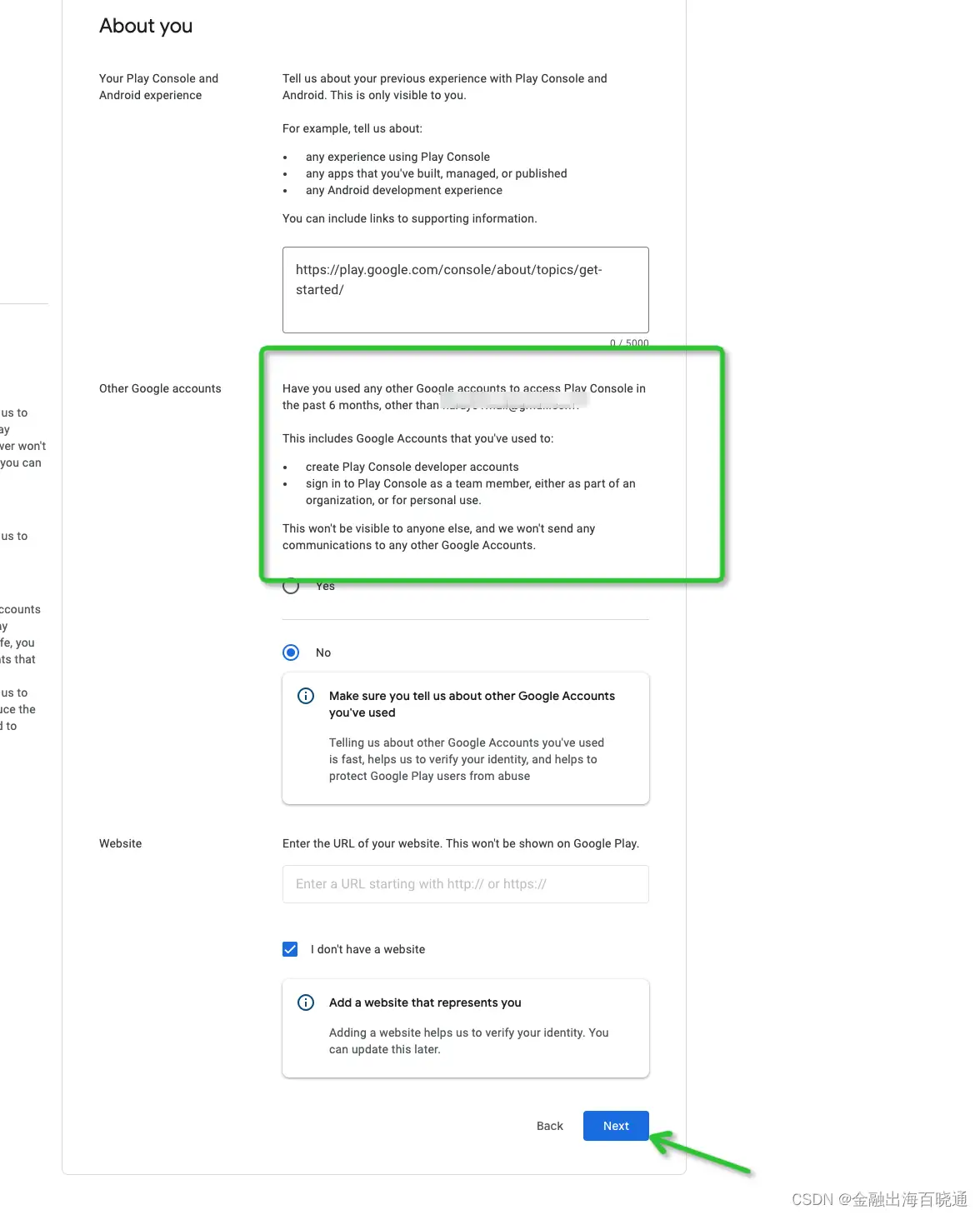 个人开发者账号第6步填写使用Play 控制台的经验:6个月内是否使用过其他Google 账号操作过Play 控制台,所以这里直接填写否就行,官网地址(会在Google Play 应用上展示)没有可以不填。