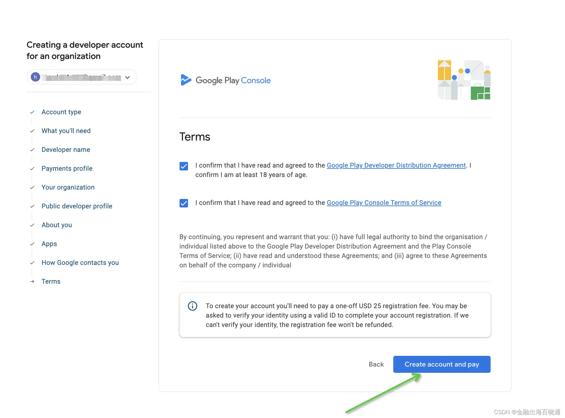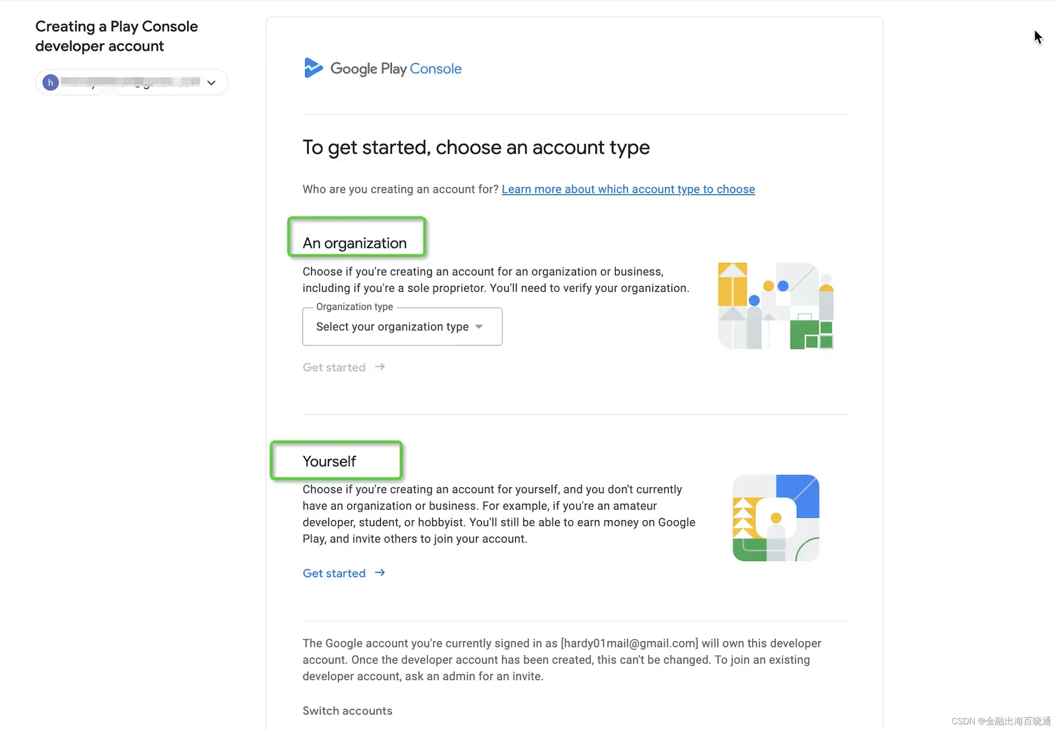 1. 进入开发者账号注册页面,登录我们刚申请的Google账户进入选择账号类型页面(个人账号还是公司组织账户),然后选择公司组织账户