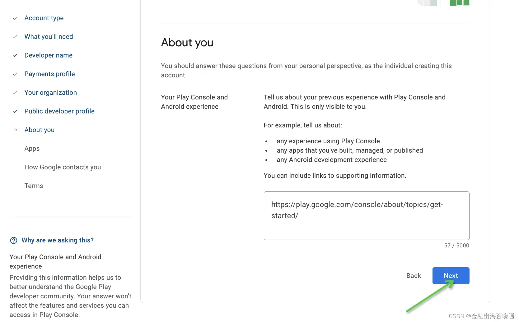 6. 填写使用Play 控制台的经验(我填写的是官方文档地址或者根据你自己实际情况填写)