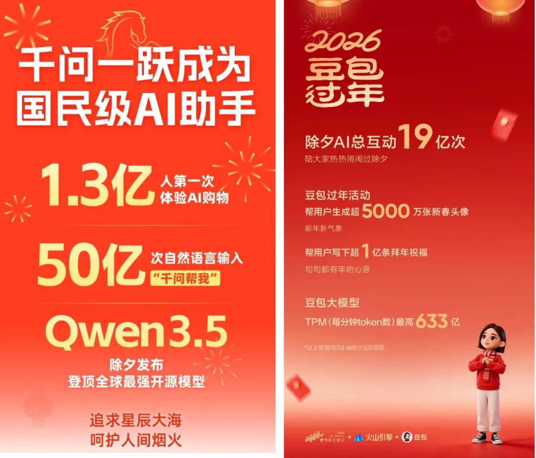 千问官方透露,春节活动期间,超过1.3亿人通过千问点奶茶、囤年货、订机票酒店。36氪报道,30亿免单活动上线后,千问DAU(日活用户数量)从不足1000万暴涨至7352万,逼近行业头部豆包。千问还在除夕当天开源 Qwen3.5-Plus大模型,实现了又一次模型的代际跃迁。